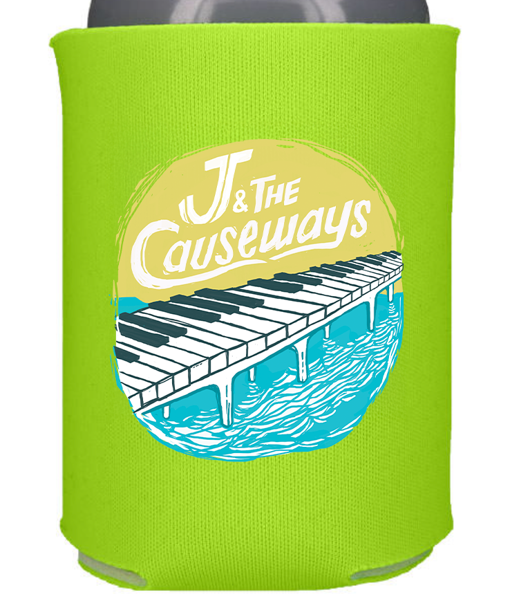Standard can-sized koozie with J & The Causeways Piano Bridge Logo
